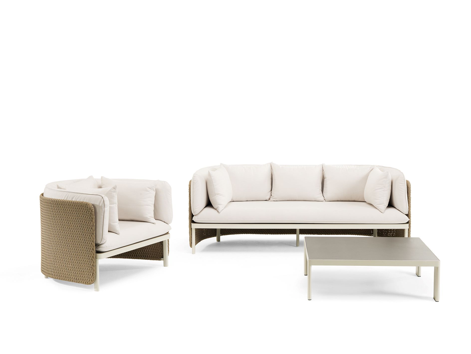Käsitellyt kuidut, jotka muistuttavat luonnollisia kudottuja kuituja, pehmustetut istuin-ja selkätyynyt, kangas, alumiinirunko: tiukka