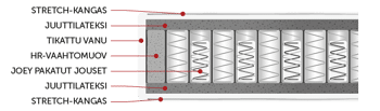 Varmistaaksemme kalusteen mahdollisimman pitkän elinkaaren käytämme vain laadukasta, erittäin tiheää HR-vaahtomuovia, joka on normaalia vaahtomuovia joustavampaa ja kestävämpää. Käytämme vaahtomuovia vain patjan sivuissa, koska siellä se on lateksia lujempaa ja kestävämpää sekä säilyttää paremmin patjan muodon.