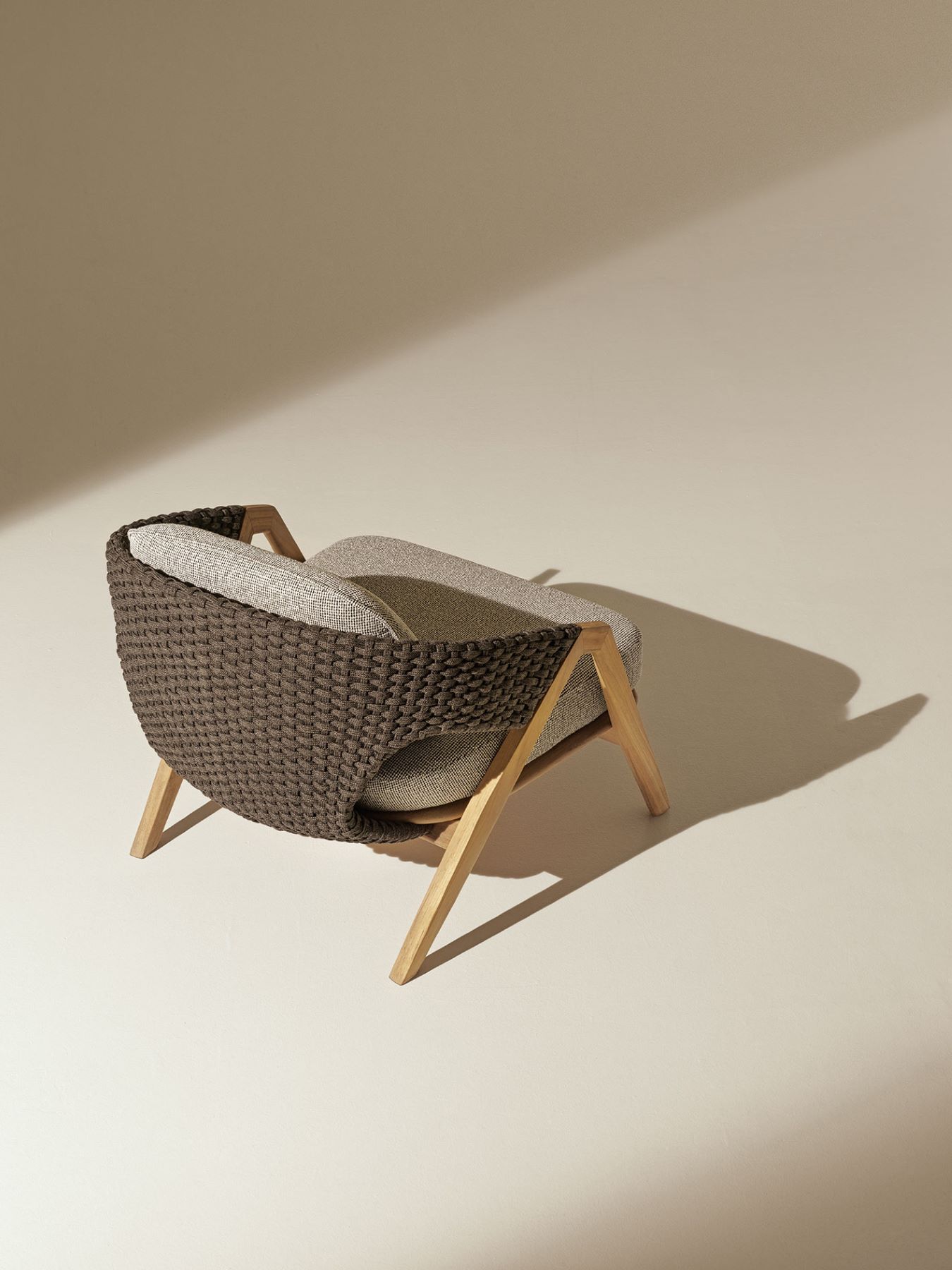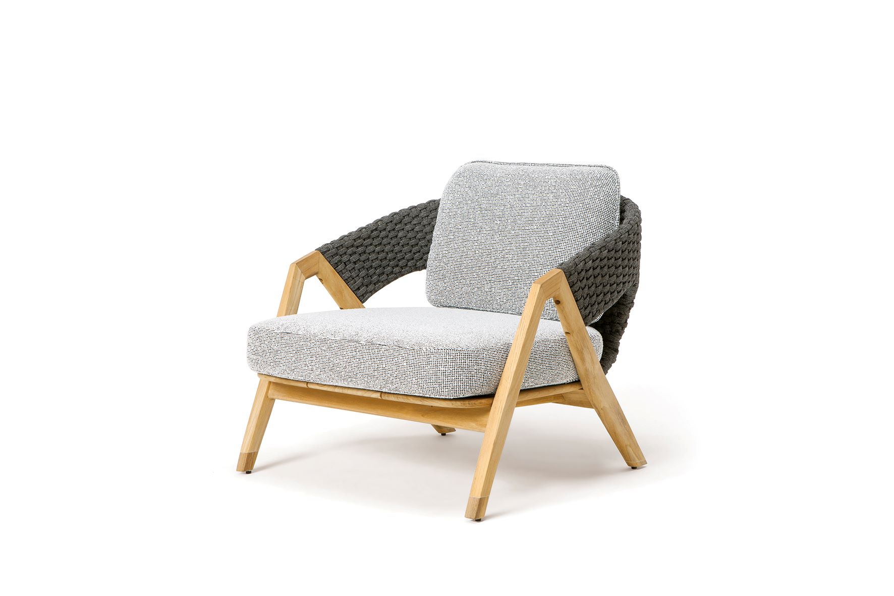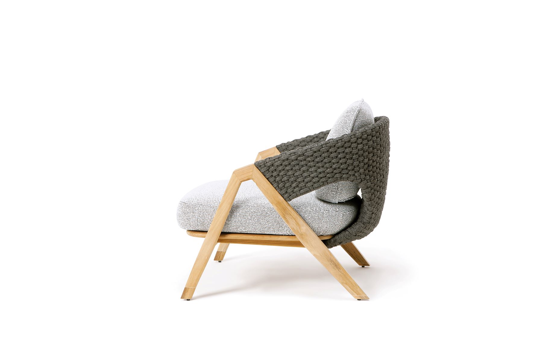 Tiikkipuu; köysi tummanharmaa; säänkestävät tyynyt vaaleanharmaa
