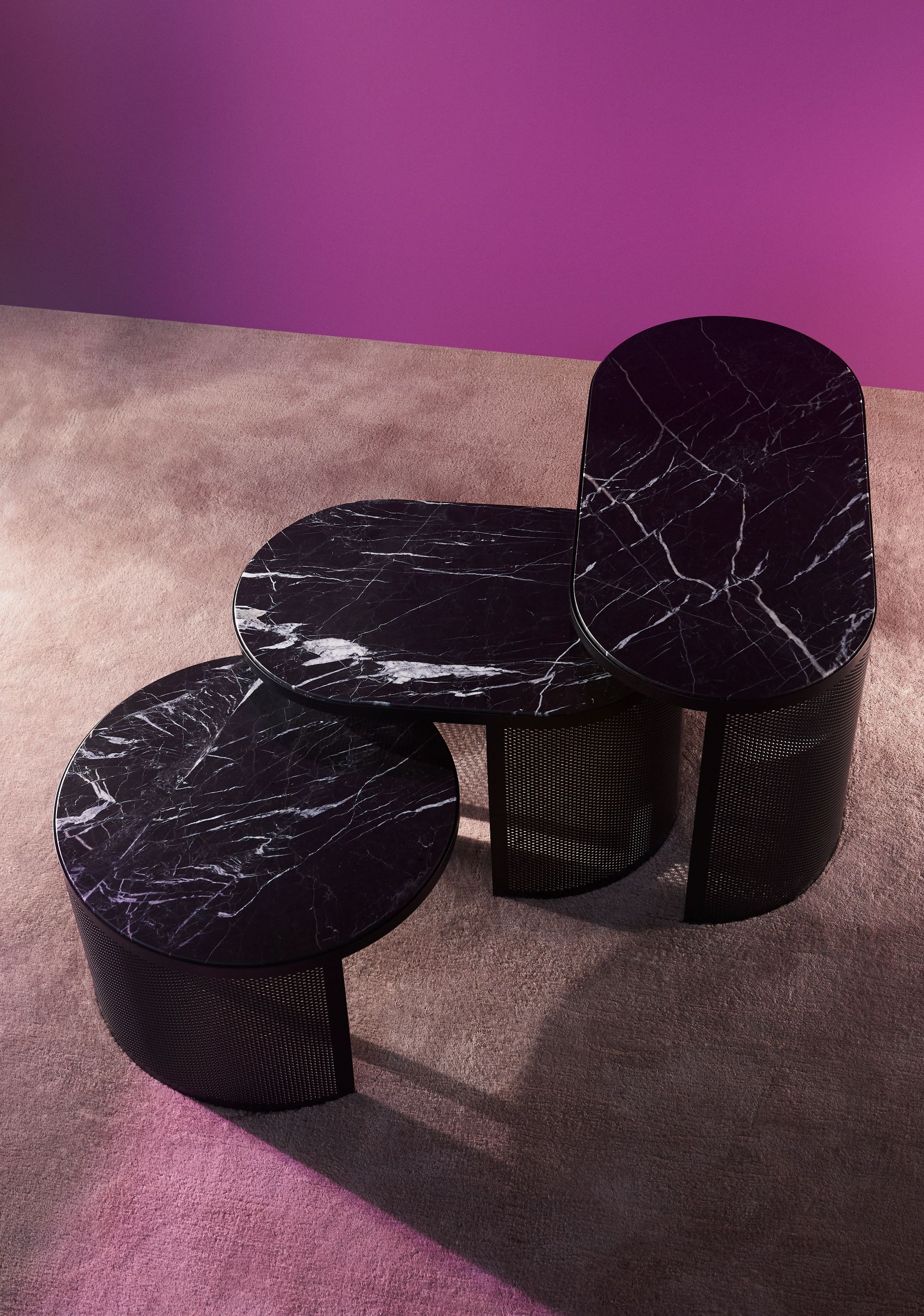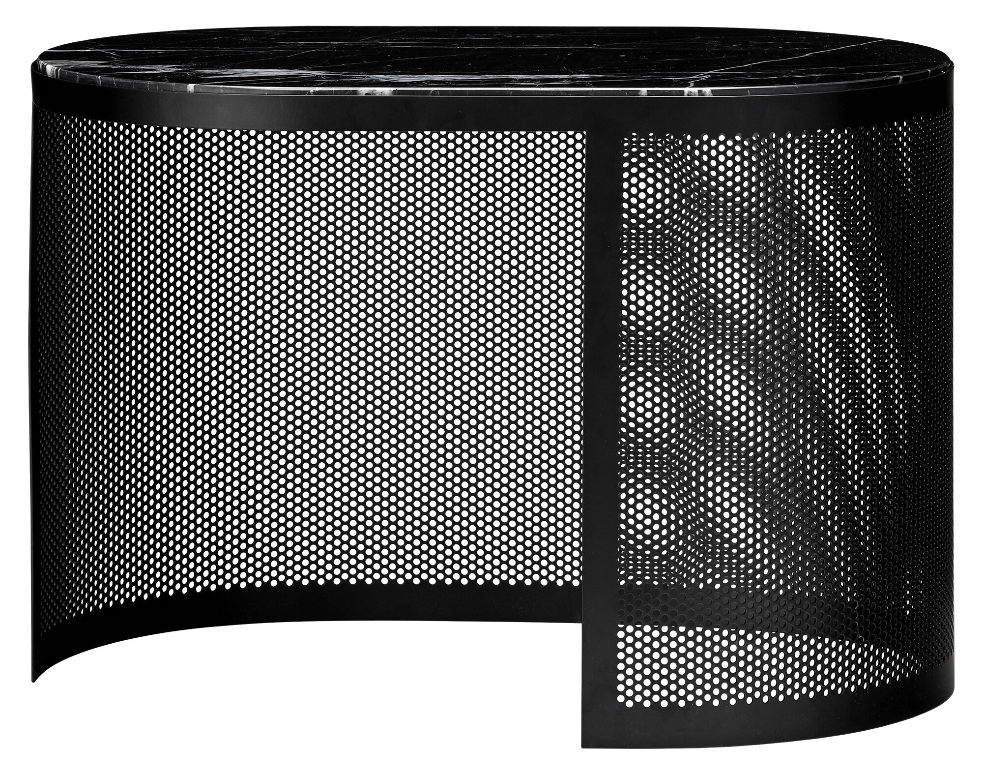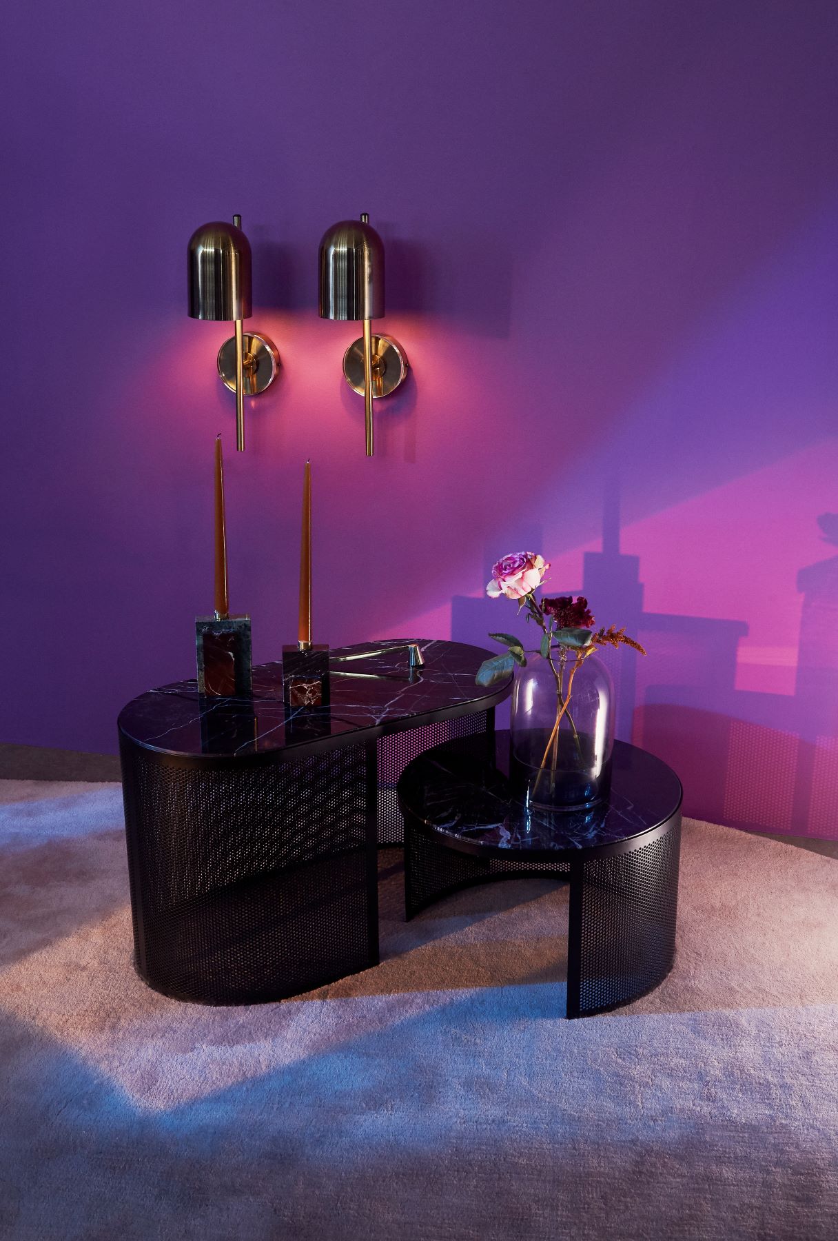 Huomiota herättävä pöytä metallialuksella sopii sekä olohuoneeseen kahvipöydäksi että makuuhuoneeseen yöpöydän sijasta. Nykyaikainen, muodoiltaan pyöreä ja ajattomista materiaaleista valmistettu pöytä auttaa tekemään huoneen yleisilmeen pehmeämmäksi ja linjakkaammaksi.