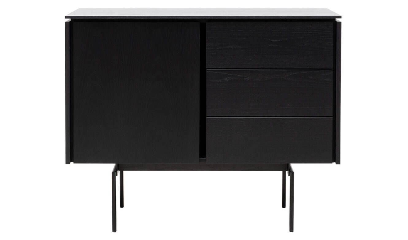 Kaappi- ja lipastosarja Salu rakentuu kontrasteihin ja linjoihin. Eri tasojen ansiosta syntyvät linjat ja varjot, jotka tuottavat graafisen, piirretyn vaikutelman. Korkeat mustat metallijalat antavat kaapille keveyden, ja push-to-open-liukukiskot tekevät vetolaatikkojen avaamisesta sujuvan.