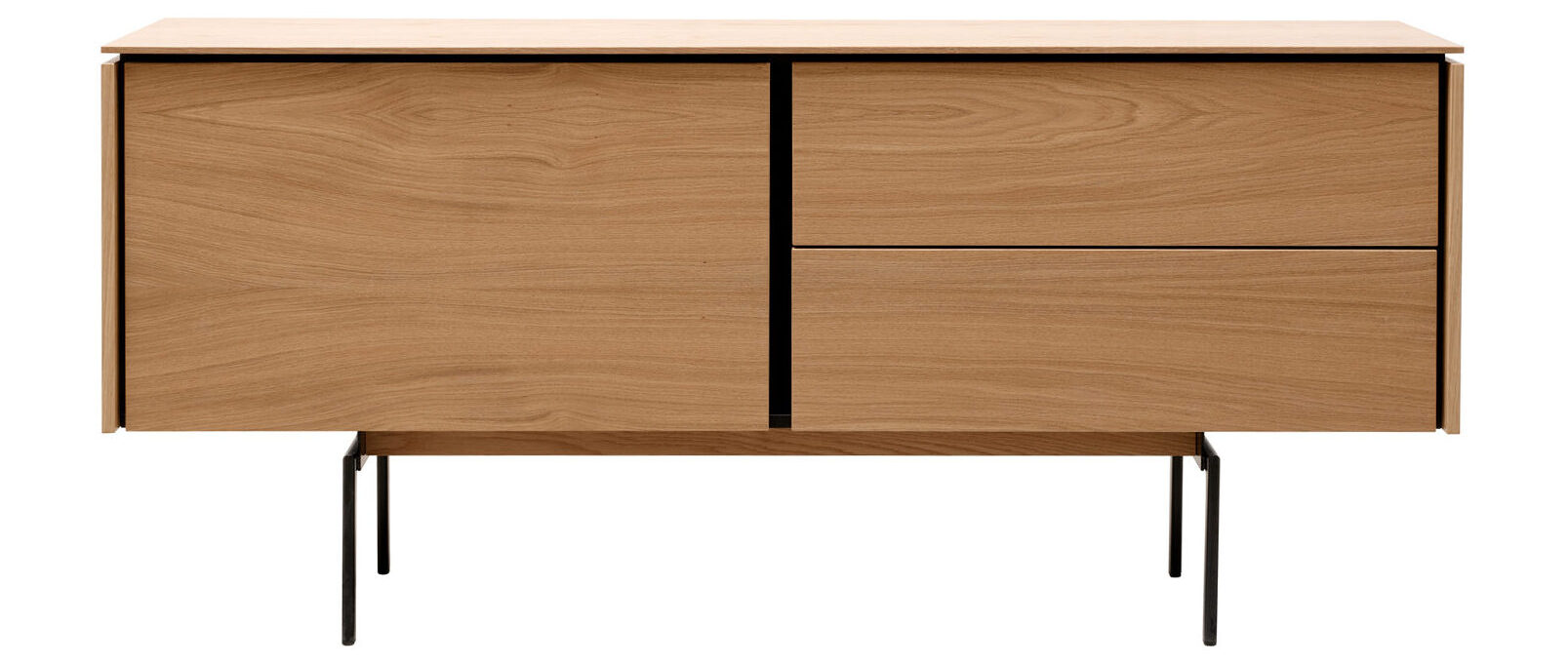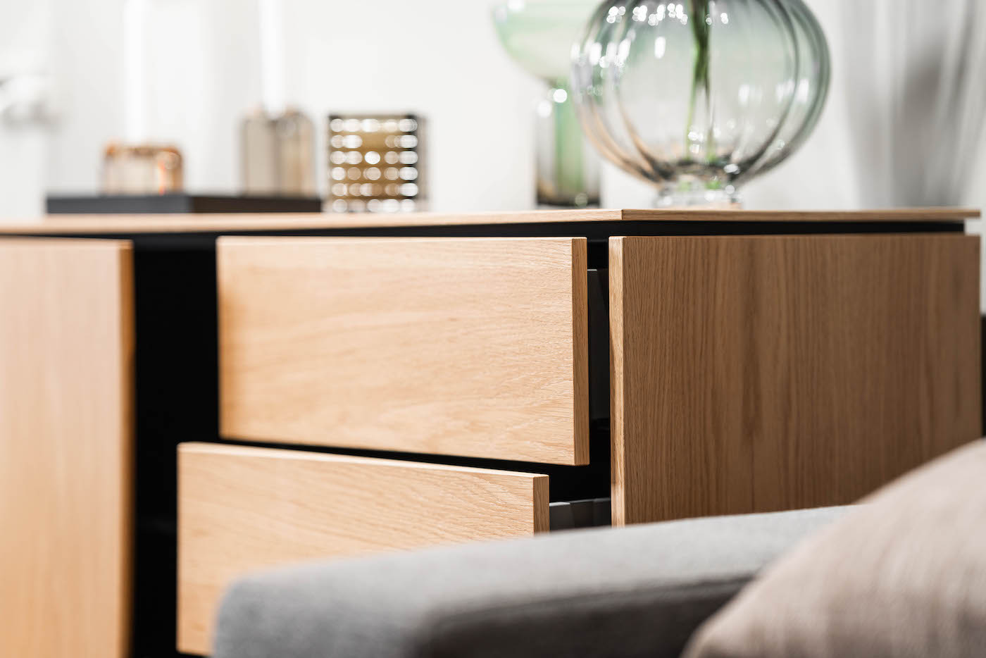 Kaappi- ja lipastosarja Salu rakentuu kontrasteihin ja linjoihin. Eri tasojen ansiosta syntyvät linjat ja varjot, jotka tuottavat graafisen, piirretyn vaikutelman. Korkeat mustat metallijalat antavat kaapille keveyden, ja push-to-open-liukukiskot tekevät vetolaatikkojen avaamisesta sujuvan.