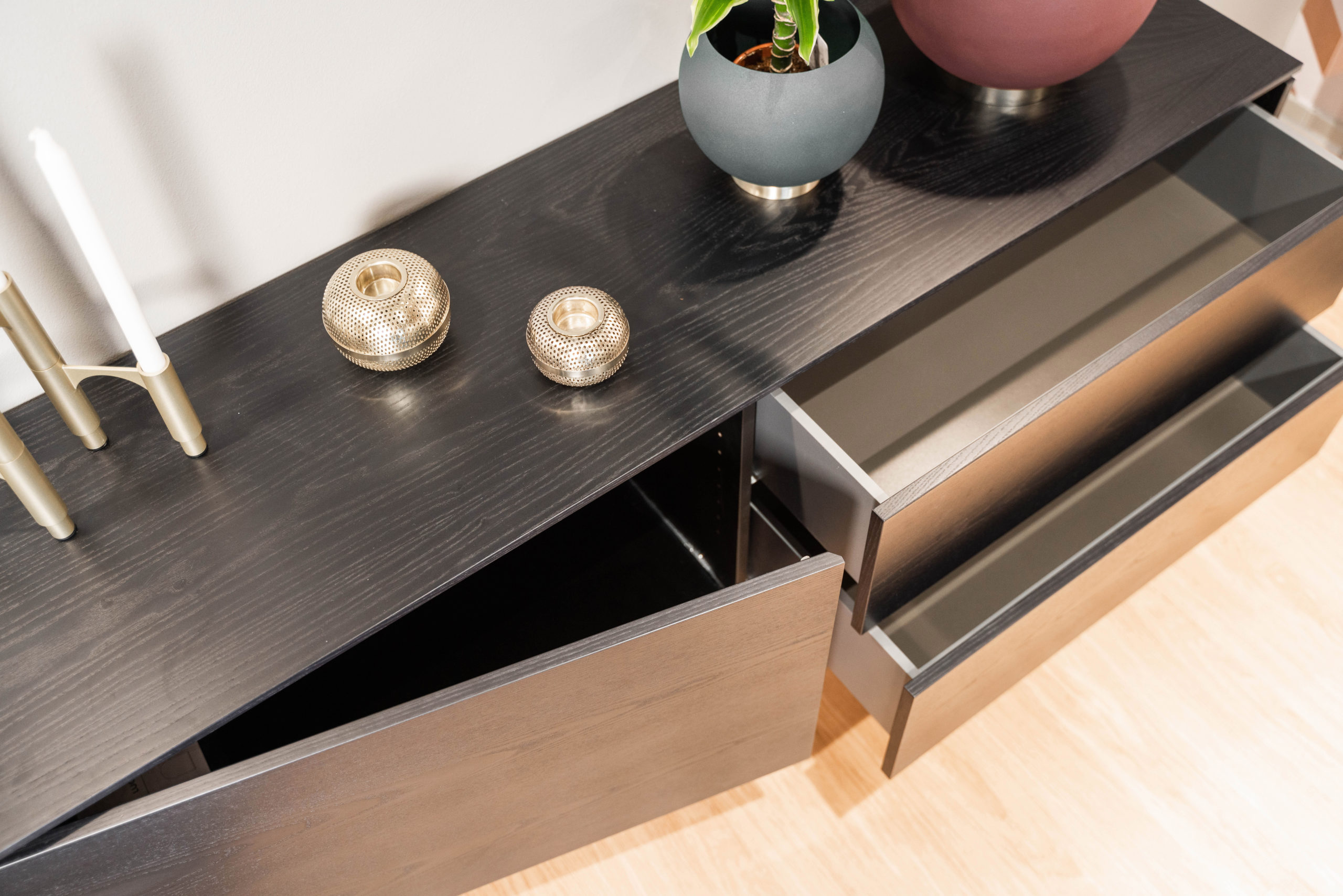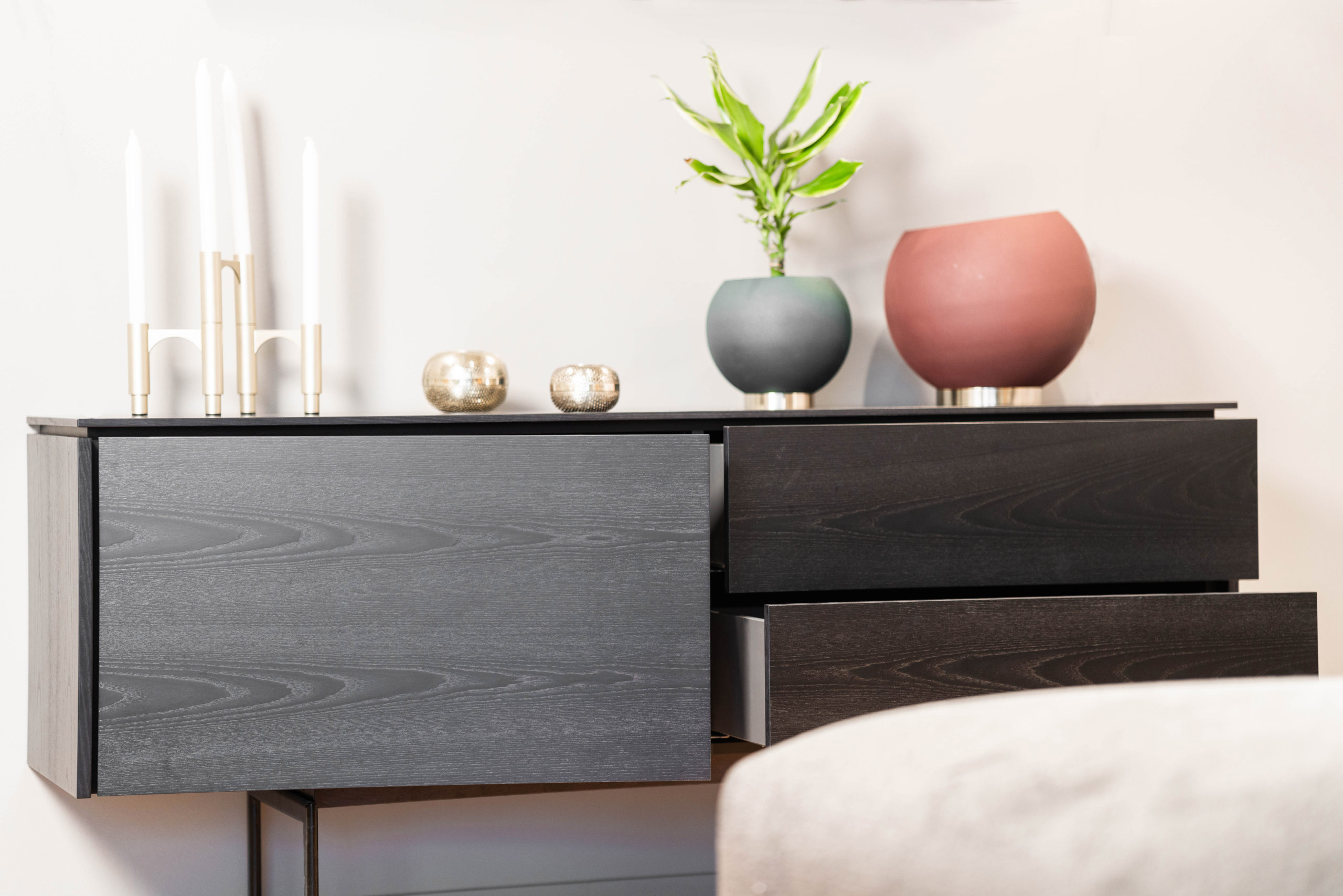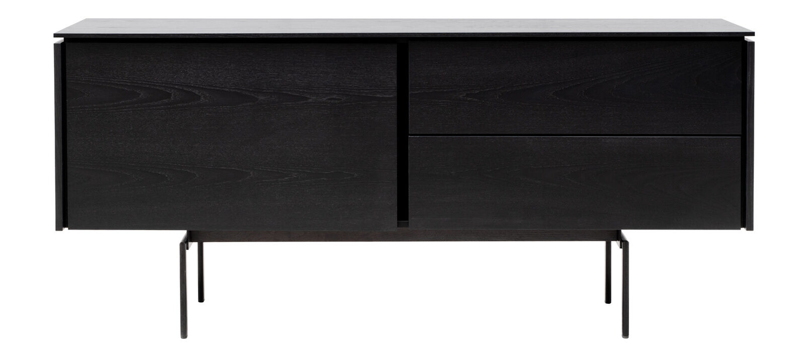 Kaappi- ja lipastosarja Salu rakentuu kontrasteihin ja linjoihin. Eri tasojen ansiosta syntyvät linjat ja varjot, jotka tuottavat graafisen, piirretyn vaikutelman. Korkeat mustat metallijalat antavat kaapille keveyden, ja push-to-open-liukukiskot tekevät vetolaatikkojen avaamisesta sujuvan.