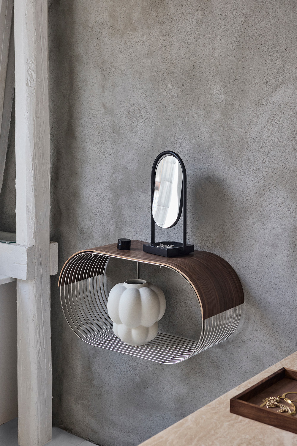 CURVA-hyllyn aaltoilevat muodot ja materiaalit ovat saaneet inspiraationsa meren liikkeistä. Sen minimalistinen muotoilu tarjoaa rajattomasti mahdollisuuksia – hylly mukautuu helposti elämäntyyliisi ja käyttöönsä. CURVA toimii monipuolisesti niin käytännöllisenä istuimena eteisessä kuin näyttävänä seinäelementtinä. Veistokselliset metallilangasta muotoillut linjat tuovat tilaan eloisuutta, ja yksinkertainen design sulautuu luontevasti erilaisiin sisustuksiin. Hyllyn päälle täydellisesti istuva CURVA-puutarjotin lisää sen käytettävyyttä ja tyyliä. Saatavana eri väreissä ja kokovaihtoehdoissa.