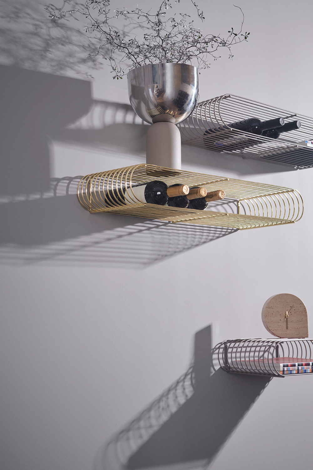 CURVA-hyllyn aaltoilevat muodot ovat saaneet inspiraationsa meren liikkeistä. Minimalistinen ja monikäyttöinen hylly mukautuu erilaisiin tarpeisiin – se voi toimia käytännöllisenä istuimena eteisessä tai näyttävänä seinäelementtinä. Veistokselliset metallilangasta muotoillut linjat tuovat tilaan keveyttä ja liikettä, ja selkeä design sulautuu saumattomasti mihin tahansa sisustukseen. Hyllyä voi täydentää CURVA-puutarjottimella, joka on suunniteltu istumaan hyllyn päälle täydellisesti. Saatavana eri väreissä ja kokovaihtoehdoissa.