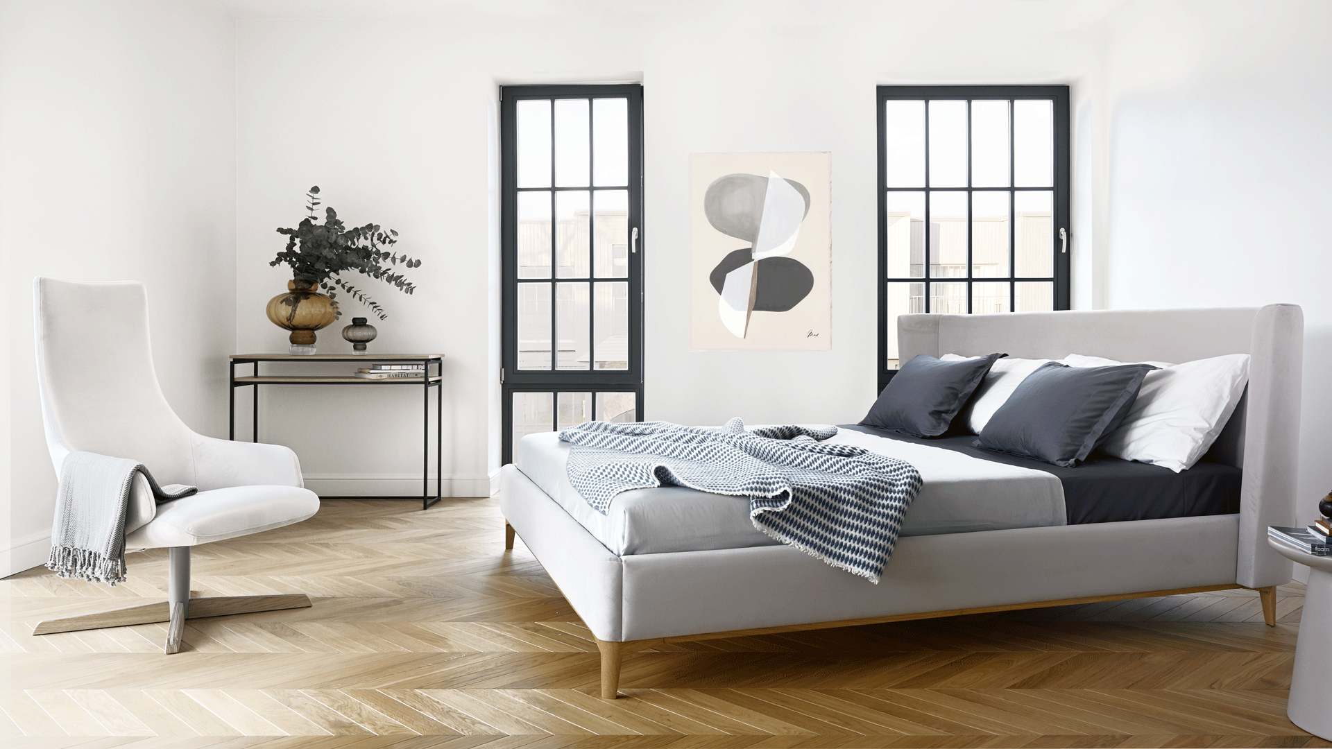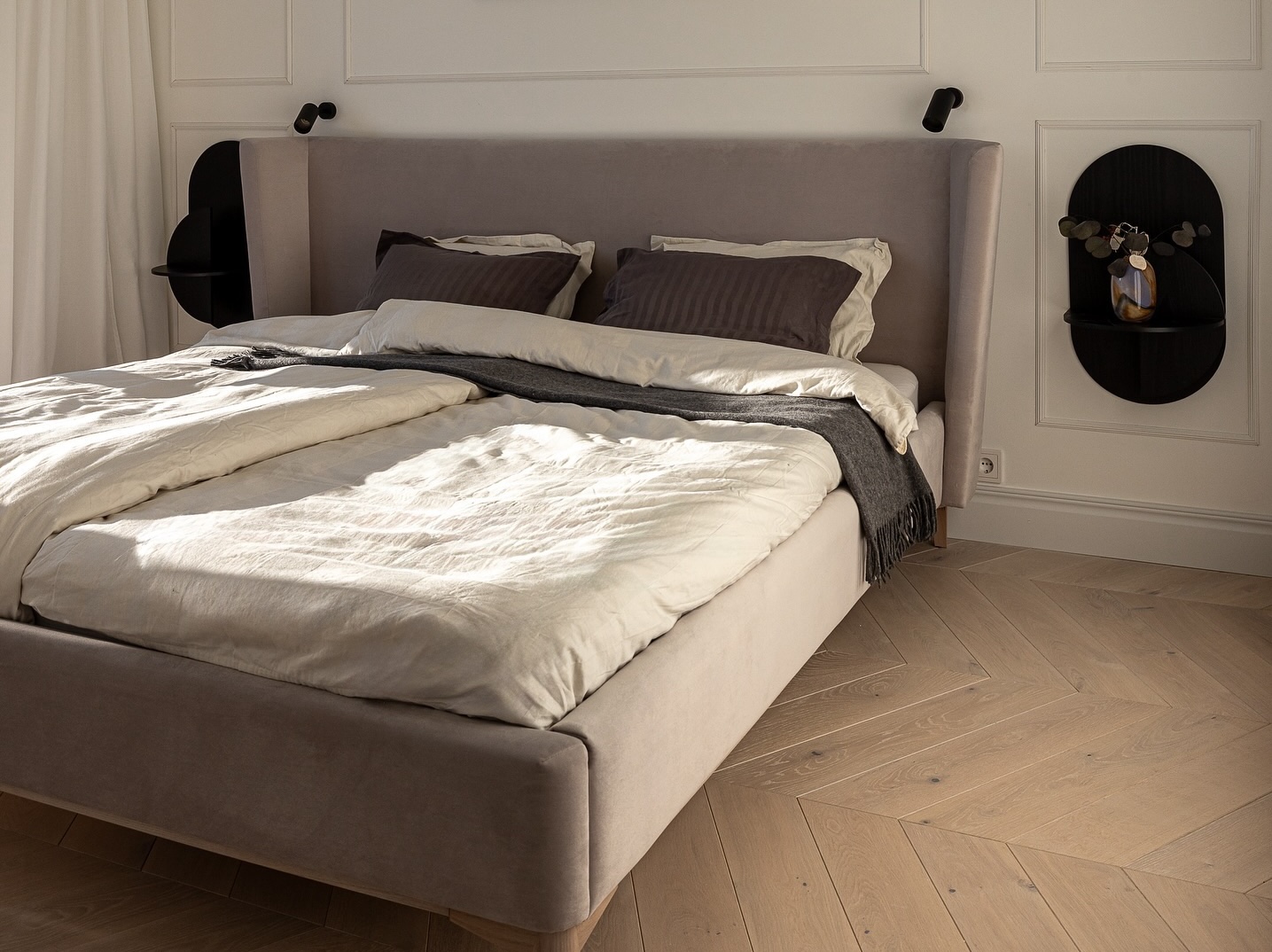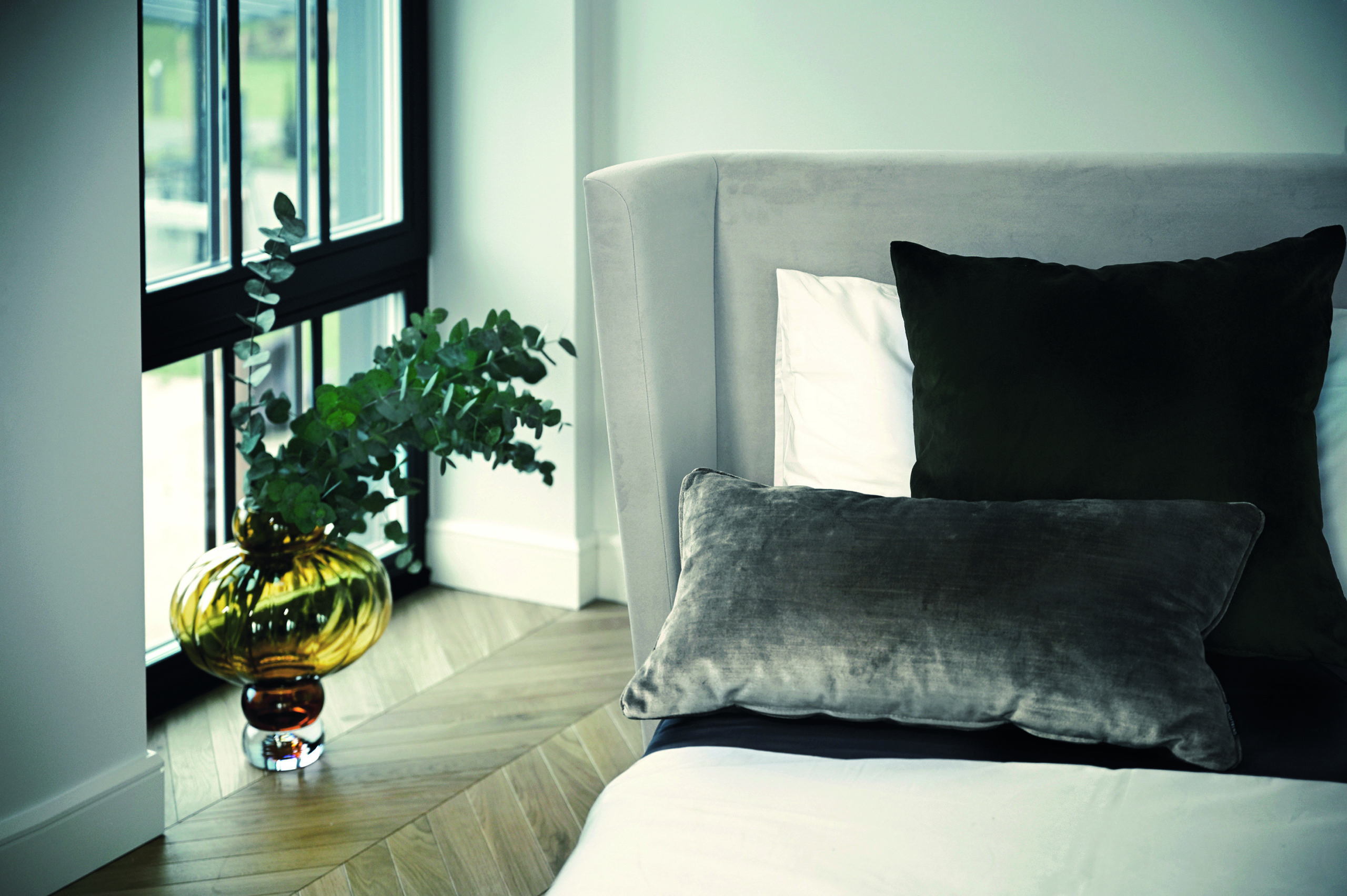 Viola-sängyn kaarevareunainen pääpuoli auttaa määrittelemään tilan ja tuo sängyn kauniina esiin myös värisävyltään neutraalilla kankaalla. Sen puinen jalkanoja on vaatimaton mutta hieno yksityiskohta, joka auttaa tekemään sängystä makuuhuoneessa huomattavan keskipisteen. Violalla on pehmeä verhoiltu runko, jossa ei ole teräviä kulmia.