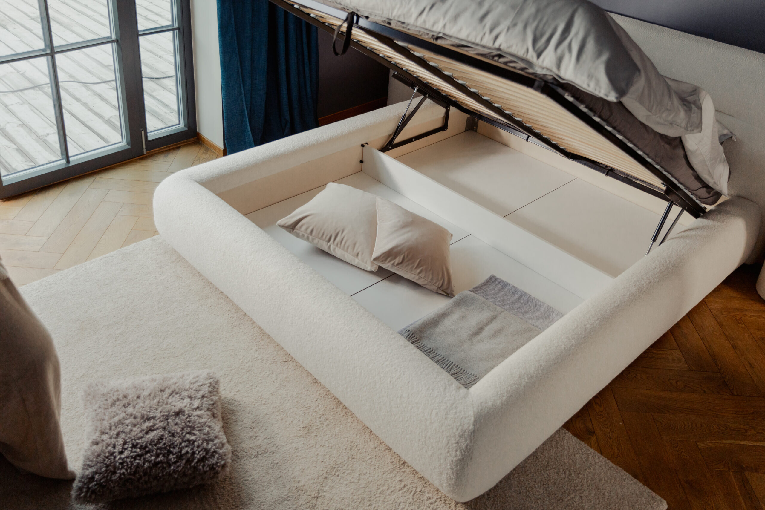 Kokonaan irrotettava verhoilu; vuodevaatelaatikollisessa joustava sälepohja, vuodevaatelaatikottomassa jäykkä sälepohja; sängyn hinta ei sisällä patjaa